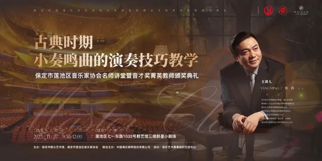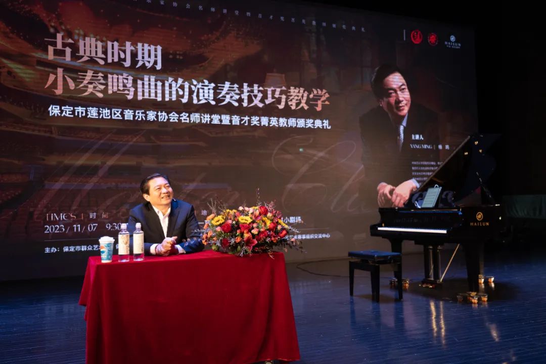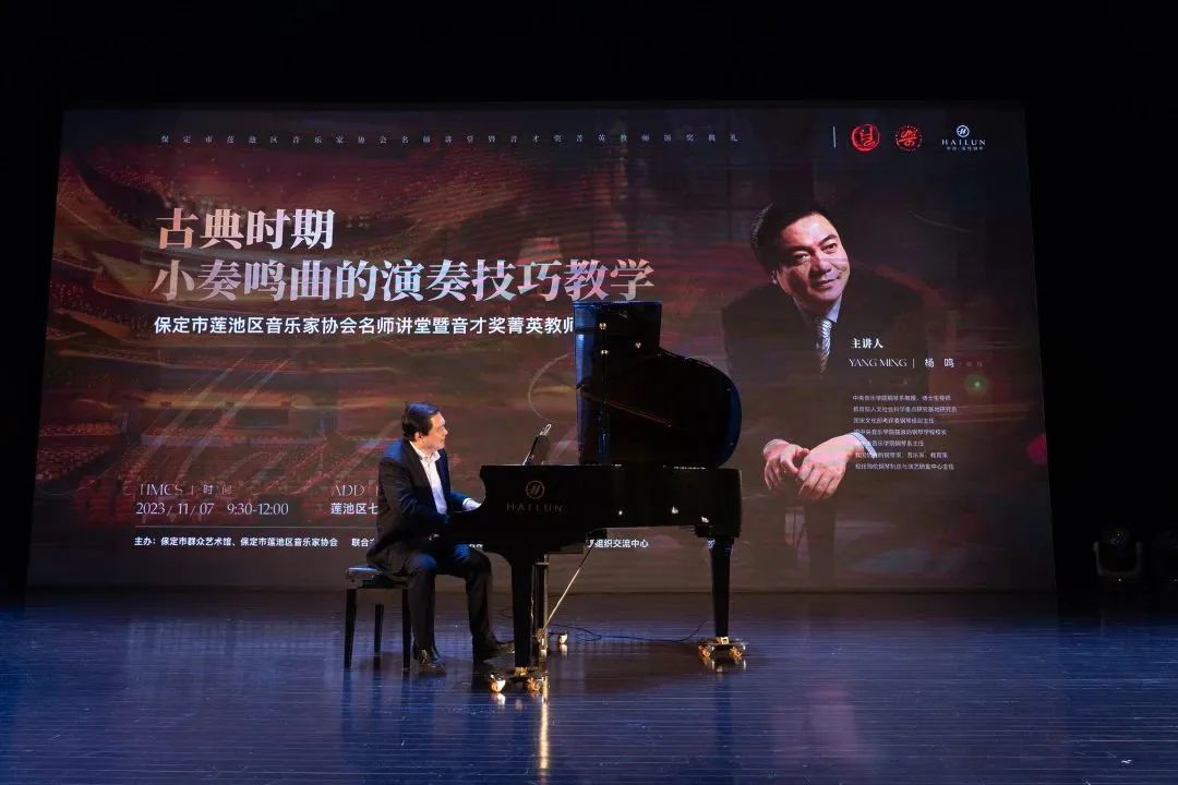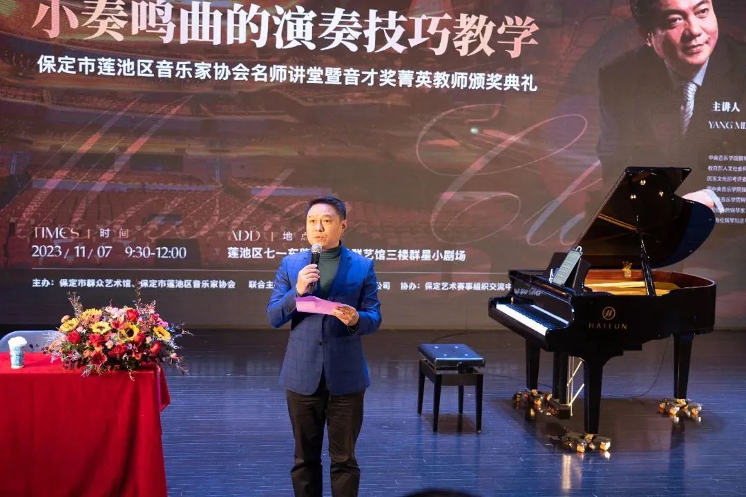 文化保定,樂享生活。11月7日,由保定市群眾藝術(shù)館、保定市蓮池區(qū)音樂家協(xié)會主辦,海倫鋼琴股份有限公司聯(lián)合主辦,保定藝術(shù)賽事組織交流中心協(xié)辦,保定市英皇樂器贊助的“保定市蓮池區(qū)音樂家協(xié)會名師講堂-楊鳴教授古典時期小奏鳴曲的演奏技巧教學暨音才獎菁英教師頒獎典禮”在保定市群眾藝術(shù)館圓滿召開。