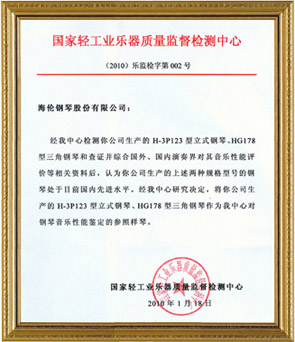 2010年1月18日,海倫鋼琴被國(guó)家輕工業(yè)樂(lè)器質(zhì)量監(jiān)督檢測(cè)中心確定為鋼琴音樂(lè)性能鑒定的參照樣琴。