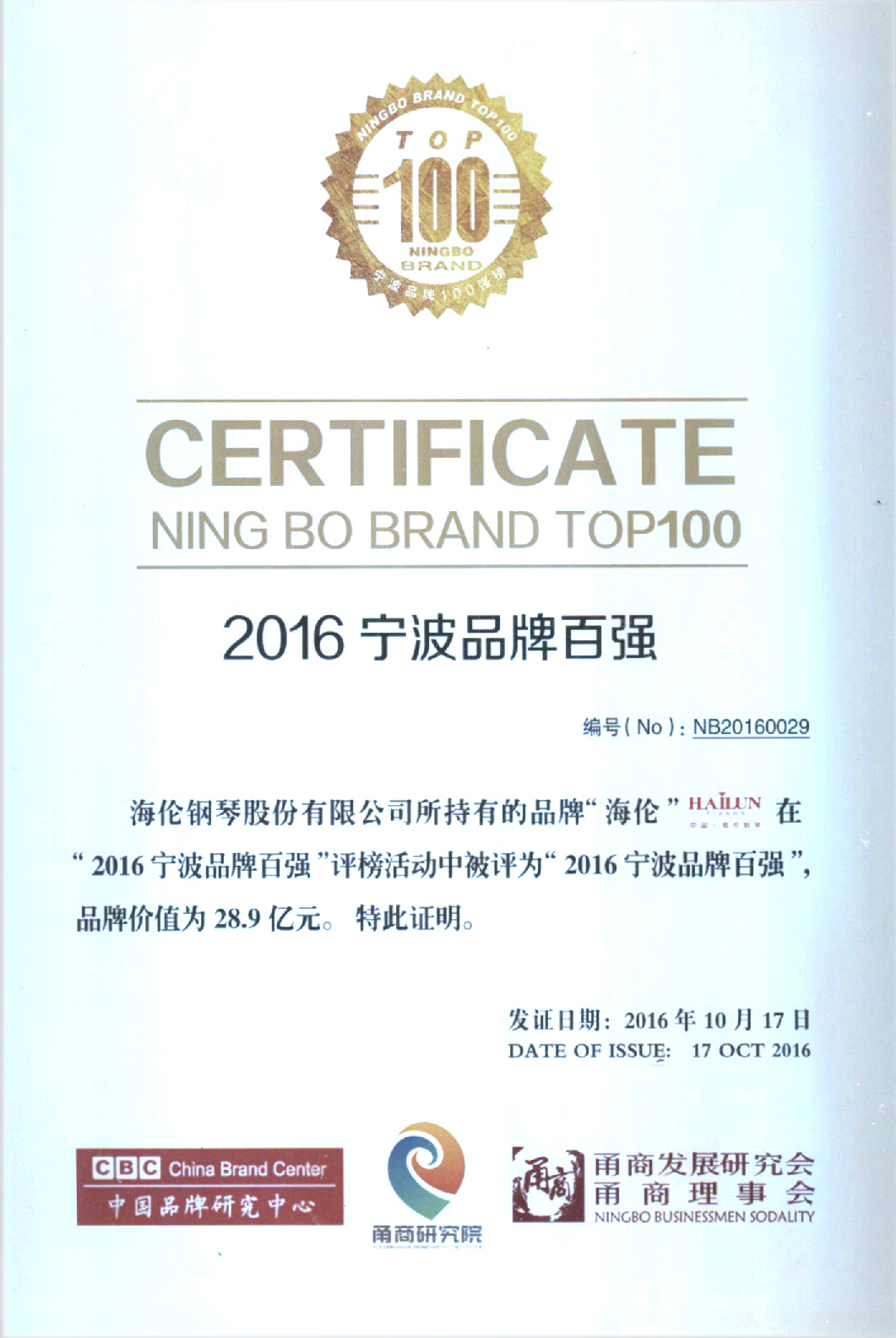 2016寧波品牌百?gòu)?qiáng) 海倫鋼琴品牌在“2016寧波品牌百?gòu)?qiáng)”評(píng)榜活動(dòng)中被評(píng)為“2016寧波品牌百?gòu)?qiáng)”。