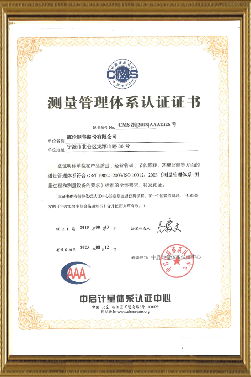 測(cè)量管理體系認(rèn)證證書(shū) 海倫鋼琴股份有限公司所生產(chǎn)的鋼琴和操作規(guī)范符合國(guó)家測(cè)量管理體系的規(guī)定。