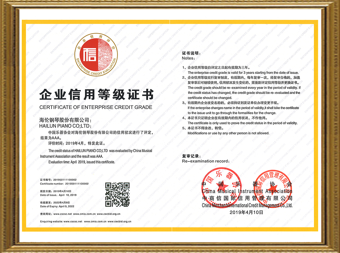 企業(yè)信用等級(jí)證書(shū) 中國(guó)樂(lè)器協(xié)會(huì)對(duì)海倫鋼琴股份有限公司的信用狀況進(jìn)行了評(píng)定,顯示結(jié)果為AAA。