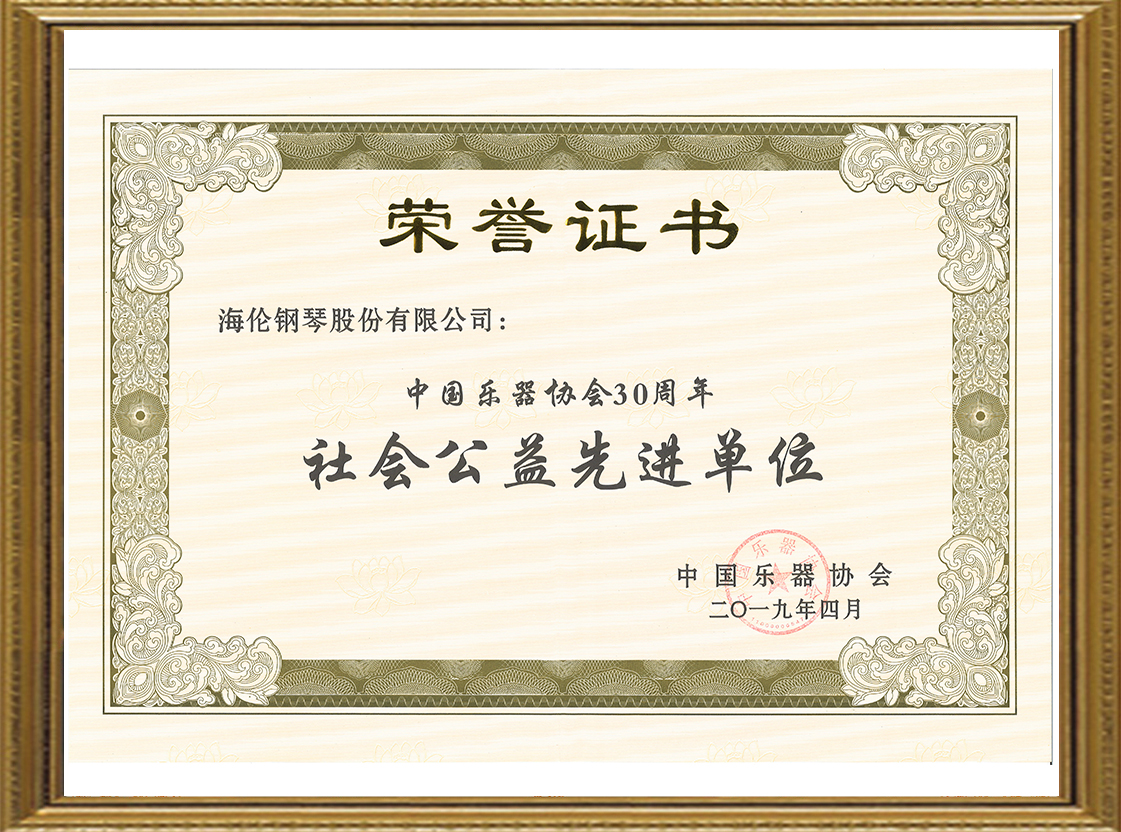 中國(guó)樂(lè)器協(xié)會(huì)為海倫鋼琴股份有限公司頒發(fā)中國(guó)樂(lè)器協(xié)會(huì)30周年社會(huì)公益先進(jìn)單位榮譽(yù)證書(shū)。