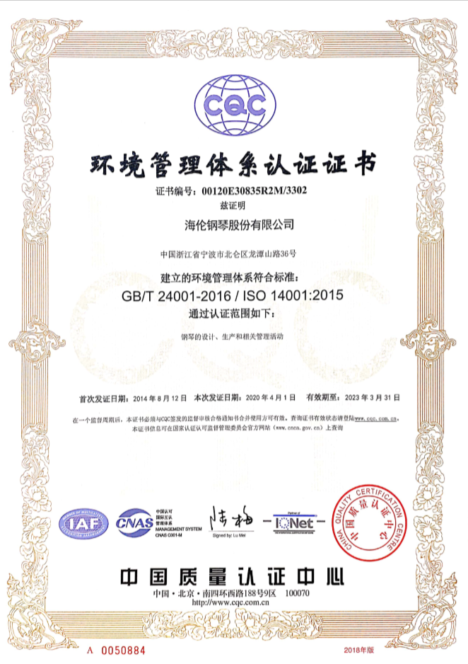 海倫鋼琴股份有限公司所生產(chǎn)的鋼琴和操作規(guī)范符合國(guó)家環(huán)境管理體系認(rèn)證體系的規(guī)定。
