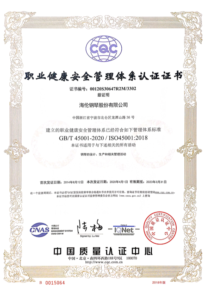 海倫鋼琴股份有限公司的生產(chǎn)作業(yè)和鋼琴制作符合國(guó)家職業(yè)健康安全管理體系認(rèn)證。